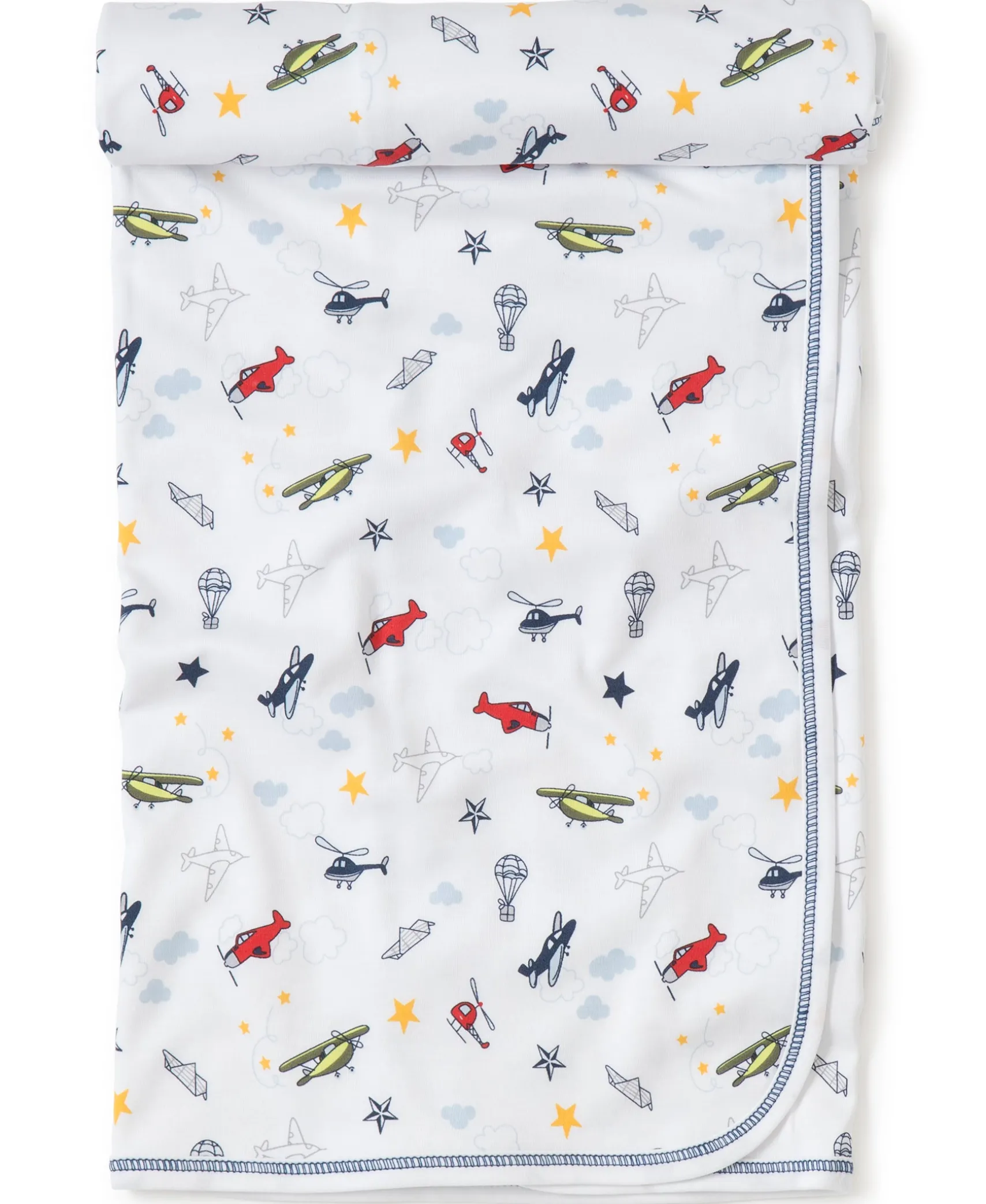 - Snuggle up with this cozy Pima cotton blanket covered in a fun and playful aviation print.