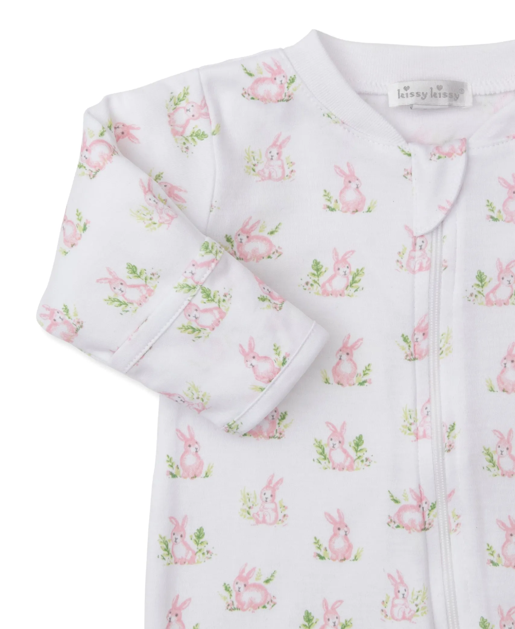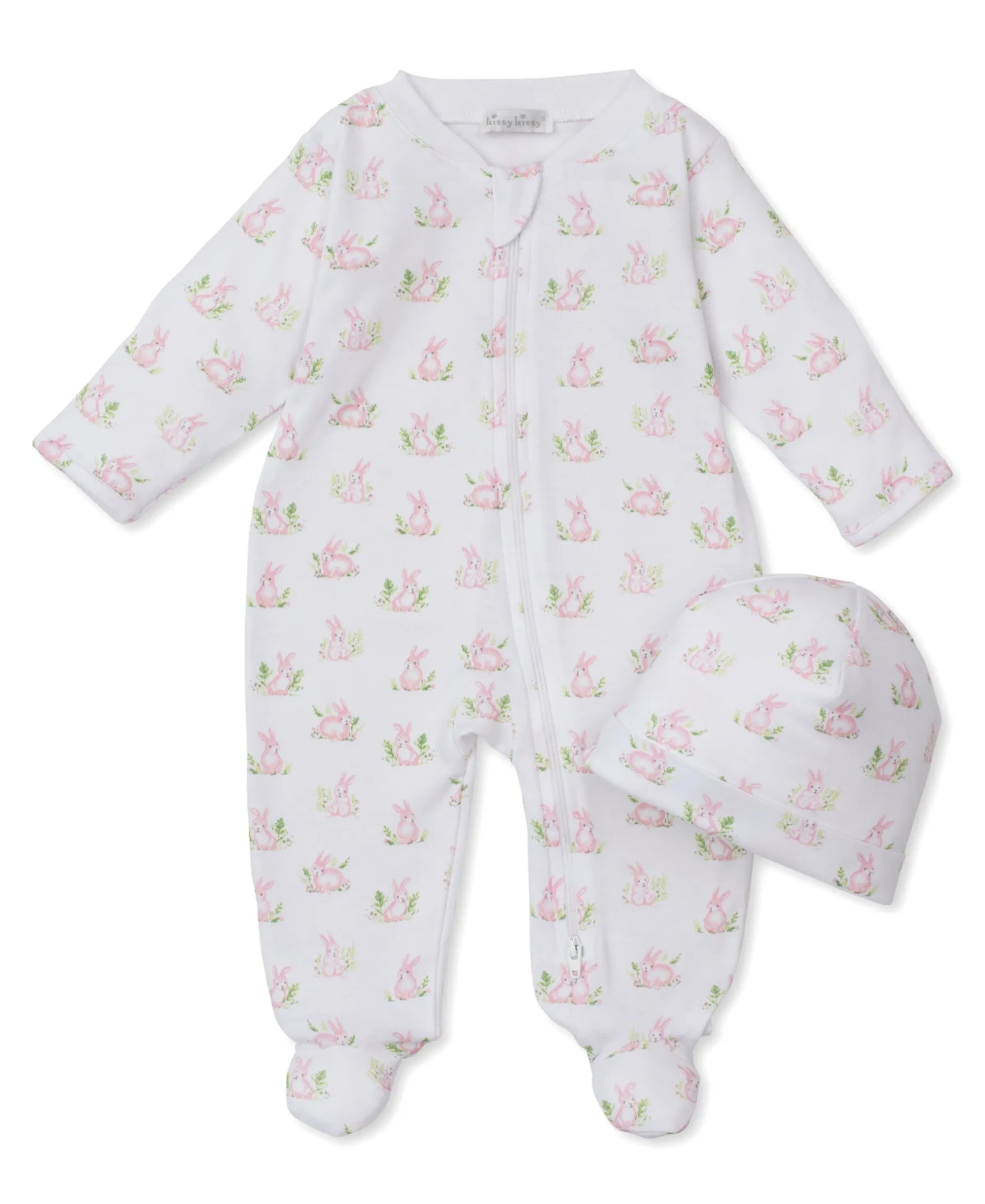 This pink cottontail hollows print two-piece set is the perfect gift to give or get. The set includes a zip footie and cozy hat for baby. Made from the softest Pima cotton for the ultimate indulgence