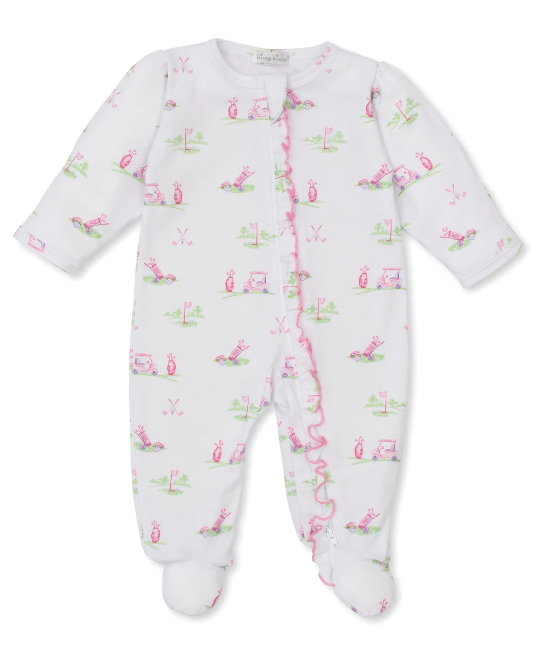 Playfully patterned with a golf print, our cozy zippered footie for your baby is made from the softest Pima cotton for ultimate comfort.