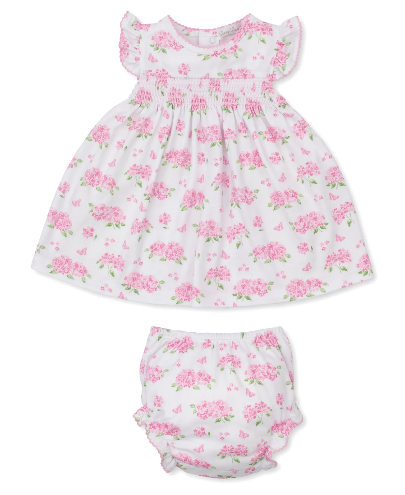 Our adorable pink heavenly hydrangeas print patterns this baby dress set, complete with a diaper cover. Made from 100% Pima cotton for a soft and comfortable fit.