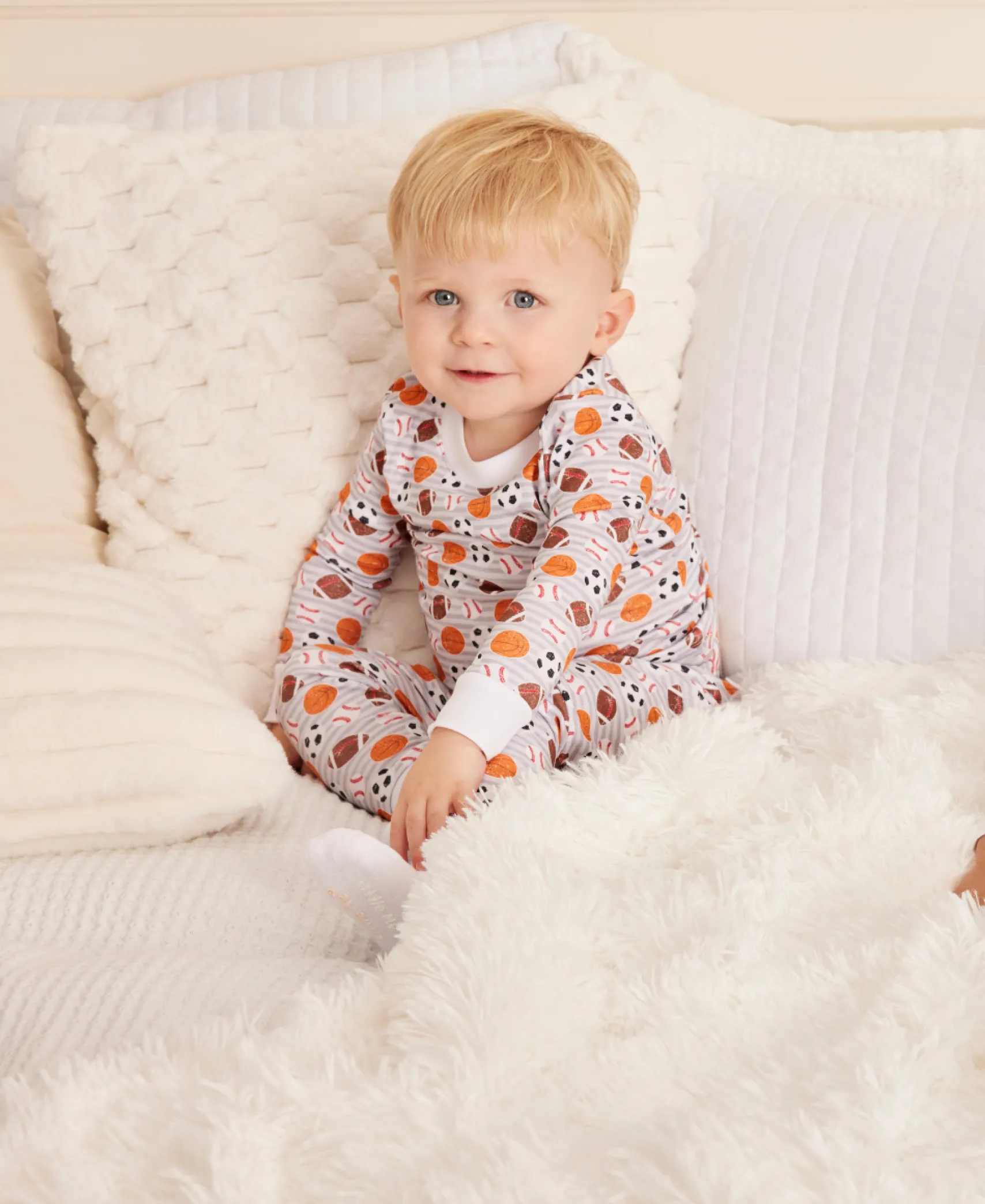 Drift into dreamland in our playfully patterned, two piece pajama set. Featuring our fun sports spirit print for a cozy fit. Made from super-soft Pima cotton, your precious baby is sure to get a good night’s sleep!